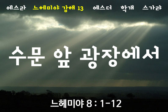 수문 앞 광장에서 새벽부터 정오까지 남자나 여자나 알아들을 만한 모든 사람 앞에서 읽으매 뭇 백성이 그 율법책에 귀를 기울였는데